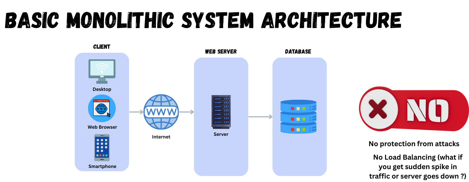 This is an architecture we still see today, and it was predominant in the early days of the internet. However, it has a major flaw — it lacks mechanisms that improve security and availability.
