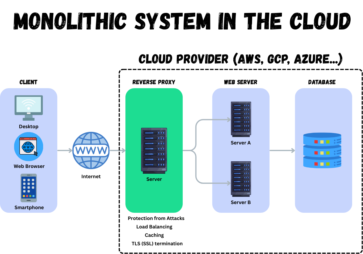 There’s one service that helps mitigate the flaws of the architecture described above. Some call it a reverse proxy, others a load balancer or gateway. And while they are not always the same thing, they usually solve overlapping problems.