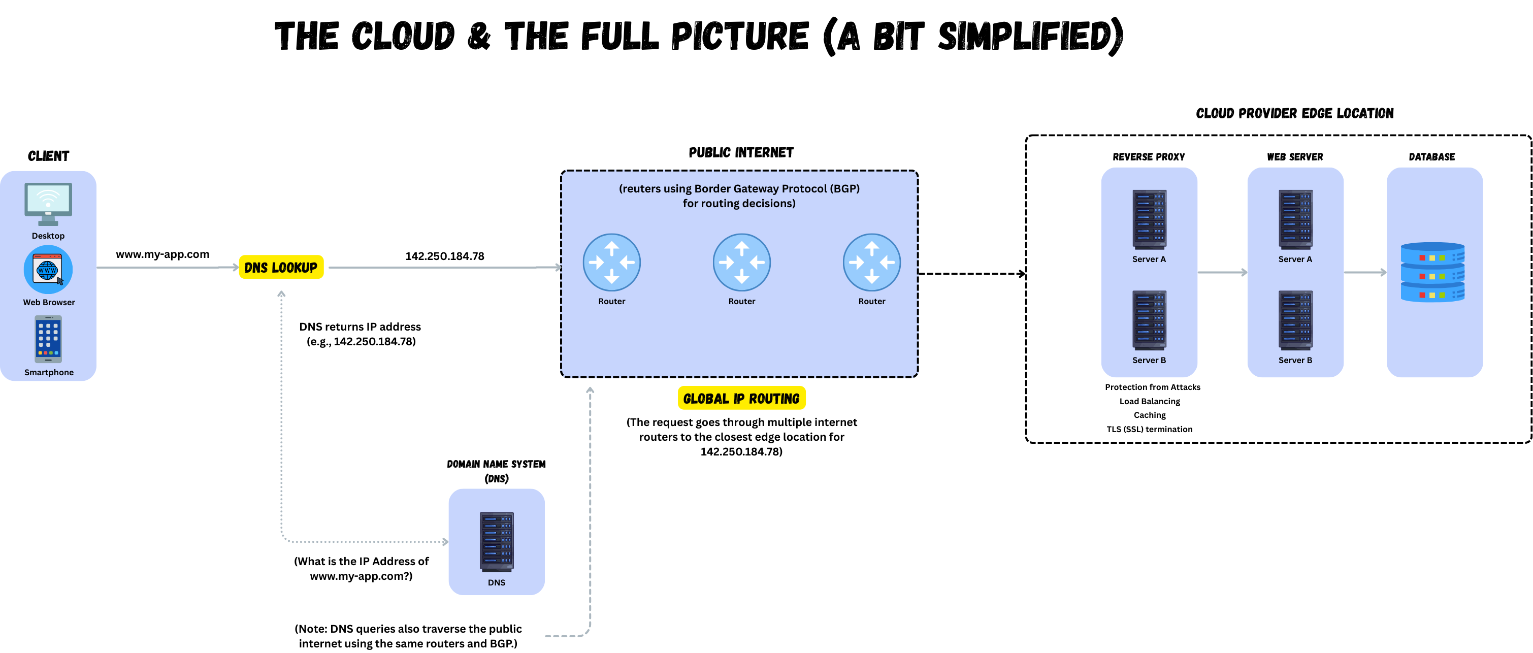I simplified the diagram above, but if you’ve read this far, I hope you now have a better idea of what happens when you visit a website—or your own app—and how and why it all happens so fast. I’m definitely going to make a video and a blog post on BGP and how it works, and I’ll write about it here as well, so I’ll keep you posted.