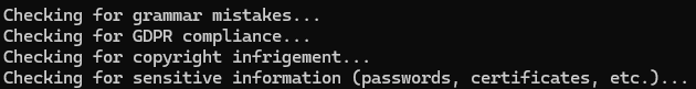 Let’s now create our concrete handlers for grammar checking, GDPR compliance, copyright infringement, and sensitive information checking.