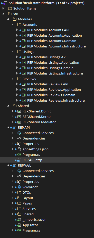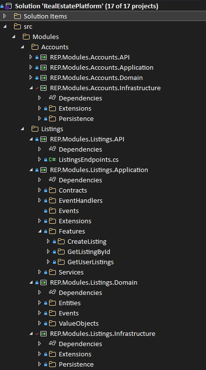The solution is structured around a Modules folders, where each module represents a distinct business capability — Accounts, Listings, Reviews, and so on.