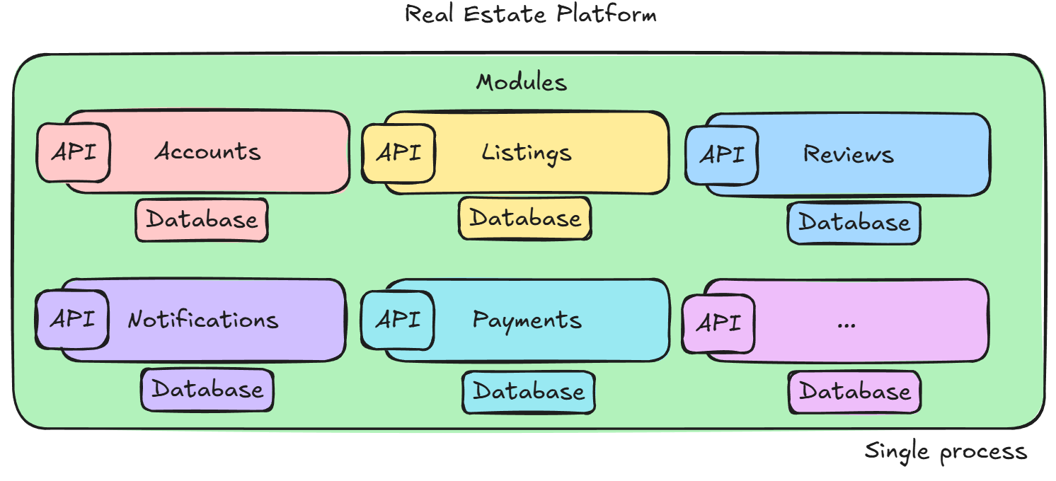 Let’s take a fictional real estate platform as an example — a place where people list their homes for others to buy. In this scenario, a Modular Monolith solution could look like this.
