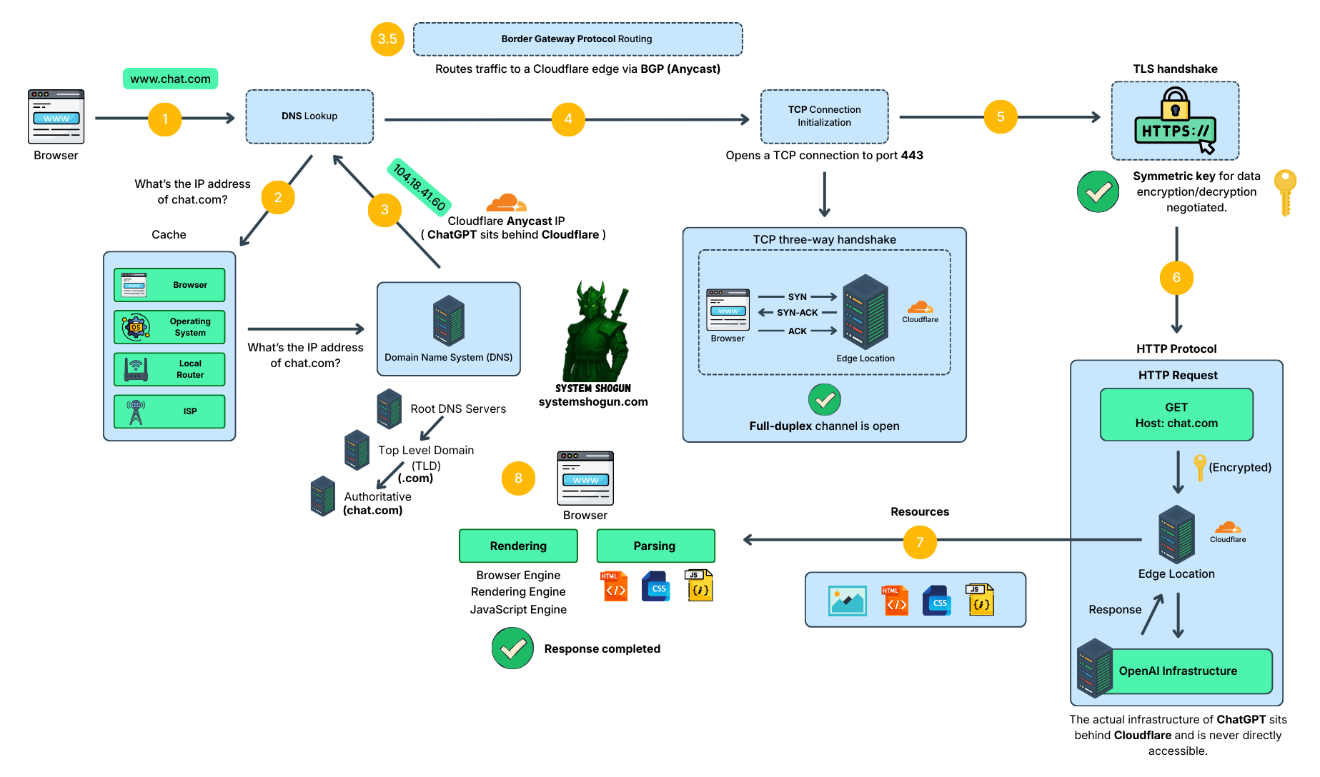 When the browser receives the response from Cloudflare, it parses the HTML, CSS, and JavaScript files and builds the DOM. The final step is rendering the page, where the browser renders the visual elements—that’s how you see ChatGPT in your browser.