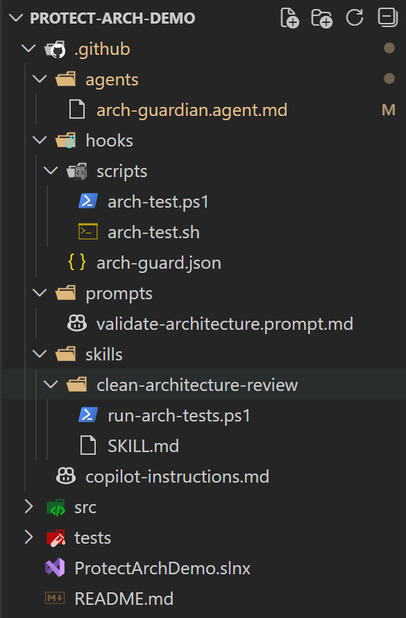 Not just src and tests, but explicit architectural guardrails built into the repository itself. Dedicated folders for agents, skills, hooks, prompts, and enforcement scripts. Architecture is not something we design at the beginning and then forget — it needs mechanisms that continuously enforce boundaries as the system evolves. And what better way to achieve that than a well-structured AI governance process with a human in the loop?