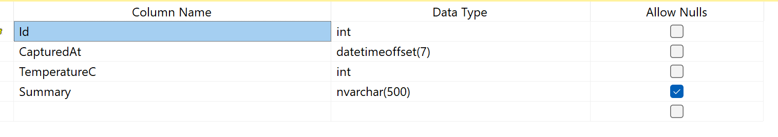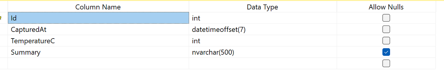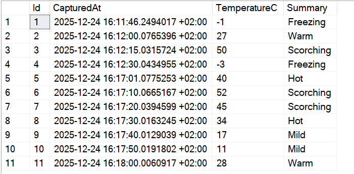 Our database has only one table called WeatherForecasts with basic structure (Id for PK, CapturedAt, TemperatureC and Summary)