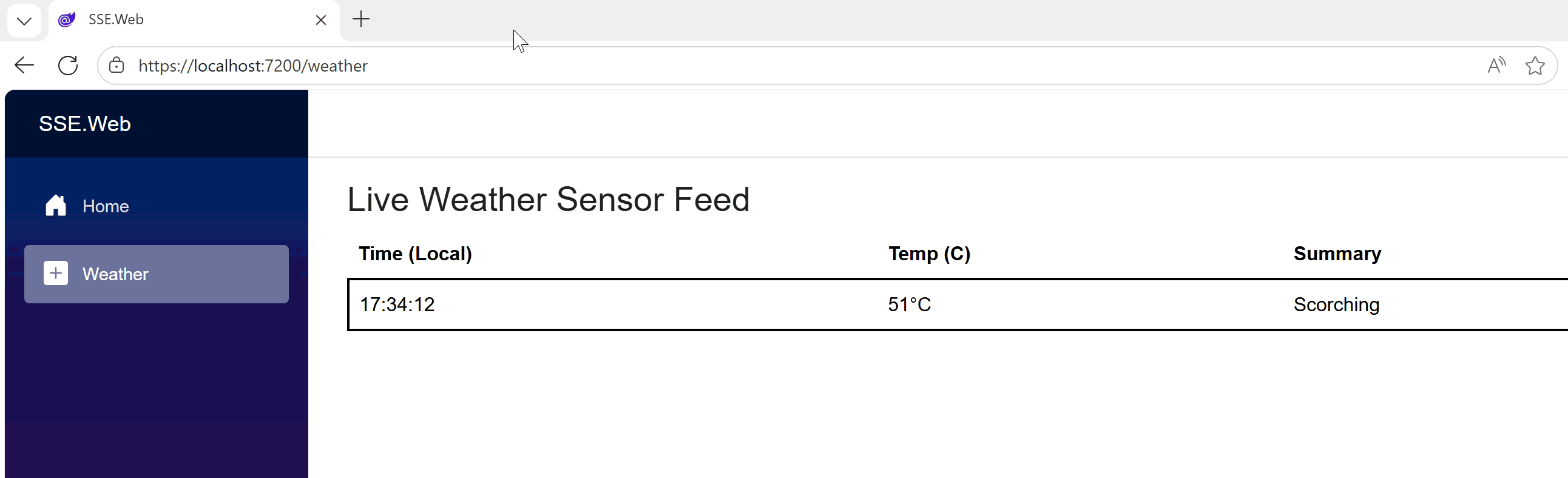 This is our client app that subscribes to the SSE endpoint and renders the live weather updates in real time.